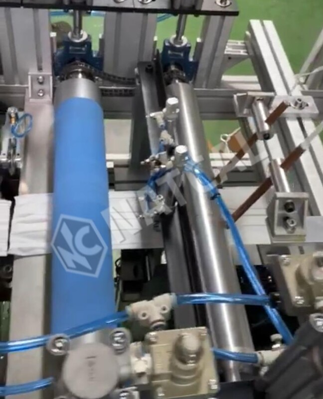 - The entrance of the machine consists of a set of three winders of fabric (100% polyester for washable or non woven fabric for surgery) that make up the mask. Prepared to accommodate bobbins up to a diameter of 250 mm for polyester and 500 mm for non woven fabric and, for both, a width of 220 mm.