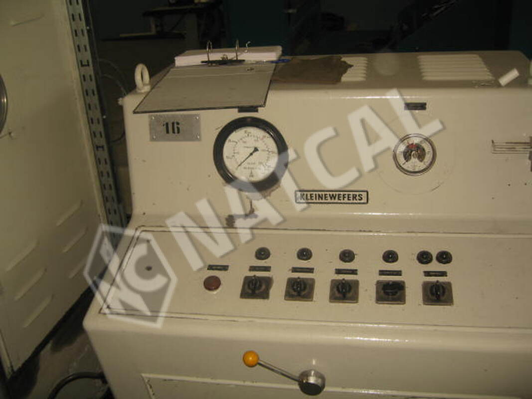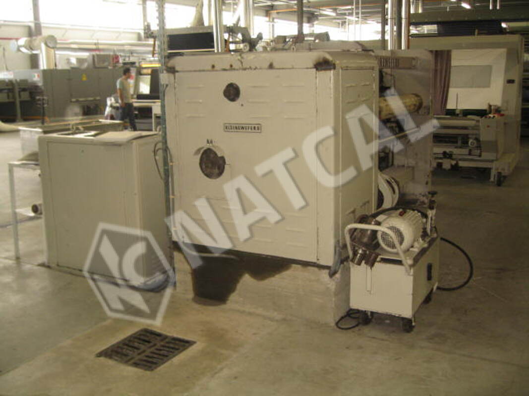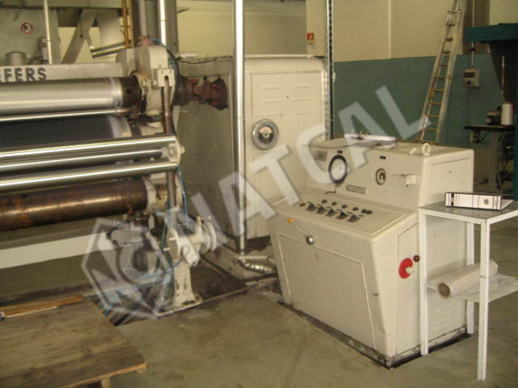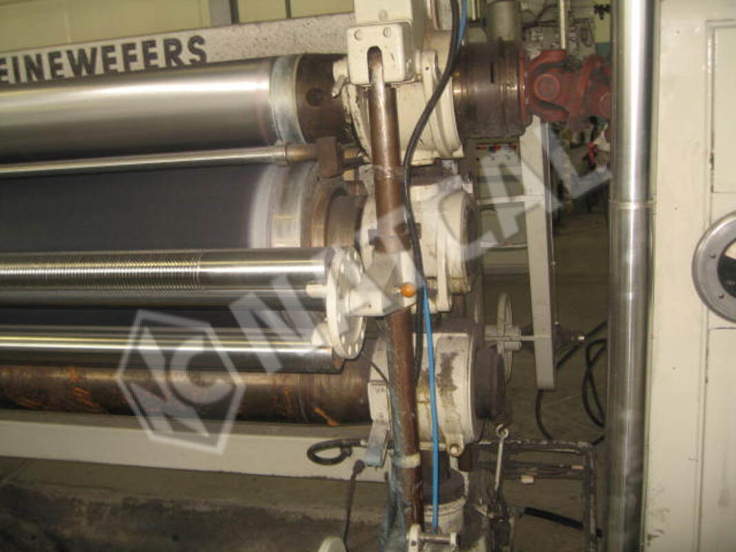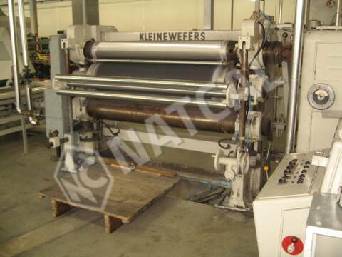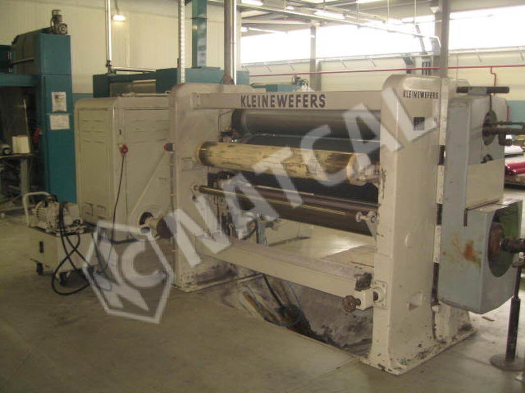 Calandra Ramisch Kleinewefers, 1.63 m, 3 cilindros (aço + algodão + aço), em que o cilindro superior de aço é aquecido a gás e o cilindro inferior de aço é aquecido a vapor